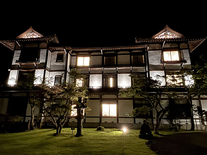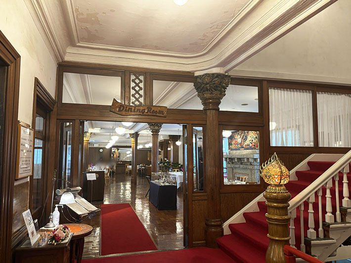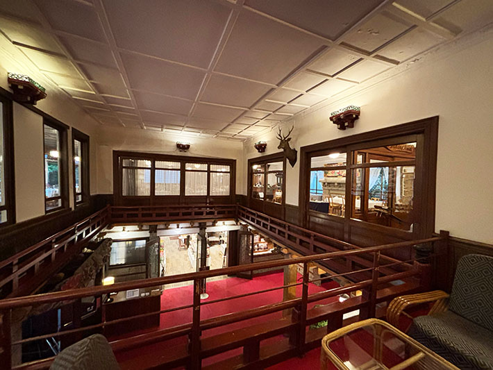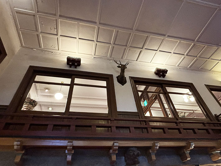営業開始時は2階建てでしたが、昭和11年に地下を掘り下げ、現在の1階部分が増設され3階建てになったため、現在のダイニングルームは、昔のフロント・ロビーでした。このように所々建物が増設されているので、館内は迷路です。