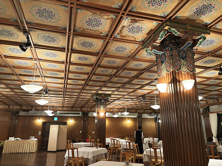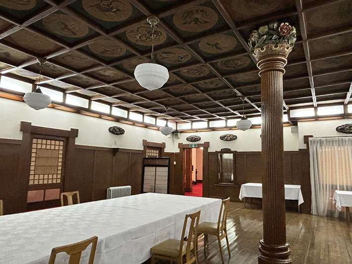 ㉓小食堂は現在、宴会や会議に使用されており。美しい格天井を持っています。
